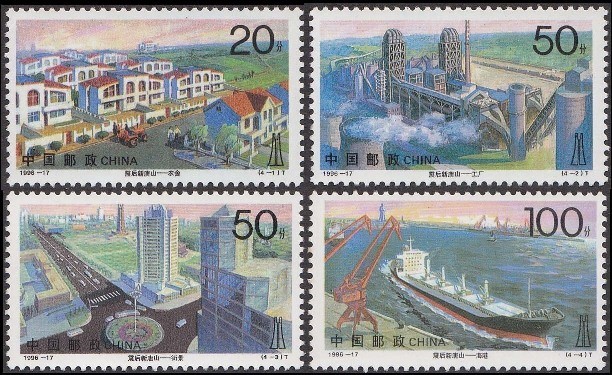 1976年7月28日凌晨3时42分53秒,我国河北省唐山地区遭遇了震惊世界的强烈地震。灾情之重,损失之巨,举世罕见。国外一些人士哀叹,唐山从地球上被“抹掉”了。顽强的唐山人民在党和国家的亲切关怀下,在全国军民的大力支援帮助下,展开了与命运之神的抗争,谱写出了气壮山河的抗震救灾、重建家园的新篇章。为纪念唐山“7.28”大地震二十周年,原邮电部1996年7月28日发行1996-17T《震后新唐山》特种邮票一套4枚。“农舍”、“工厂”、“街景”、“海港”展示了地震摧不垮的人类精神。