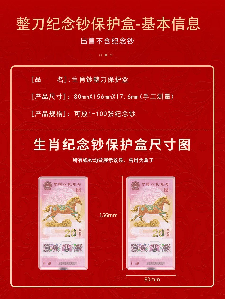 马年生肖纪念钞整刀收藏盒(100枚装)生肖纳福,不含钞