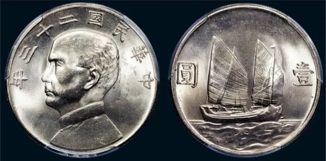 1933年,国民政府废两改元,颁布《银本位币铸造条例》,规定“所有征收税款,自用银两缴纳者,一律改用银本位币”,即所有交易及结账以圆为单位。规定每枚银圆总重26.6971克,含纯银23.493448克,并铸币值为壹圆之新版银本位币,其正面有孙中山侧面像及纪年,背面是中国双桅帆船图案和币值的“船洋”,铸造成的银圆比“袁大头”略小,含银量亦较其低。