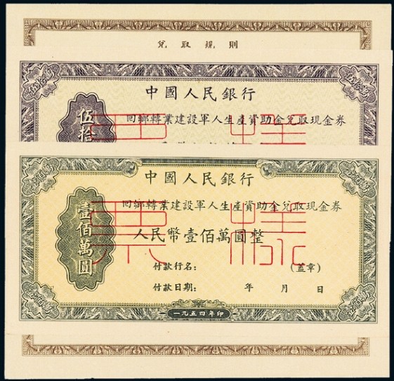 为顺利完成新中国历史上第一次大裁军的伟大使命,中央人民政府财政部特为此先后发行了四套兑换(取)现金券。第一套发行于1952年,券名为"回乡转业建设军人资助粮兑换现金券";基于当时全国各地物价差异较大,为使广大复转军人均能享受到同等的安置待遇,故本套兑换现金券的面值统一按各地主粮的数额来标定,分别为5斤、10斤、50斤、100斤和300斤五种,这也是建国以来由中央人民政府财政部发行过的唯一一套以主粮数额来标定面值的兑换现金券。1953年版因面值改按人民币币值标定,故亦将票名调整为"回乡转业建设军人资助粮兑取现金券",面值为50万元和100万元两种;1954年版的券名及面值与1953年版相同,只是颁发机构由"中央人民政府财政部"改为"中国人民银行";1956年版因在币制改革之后,故将面值相应调整为50元和100元二种。前三版的现金券存世量相对稀见,估计约在数拾枚至百枚之间。