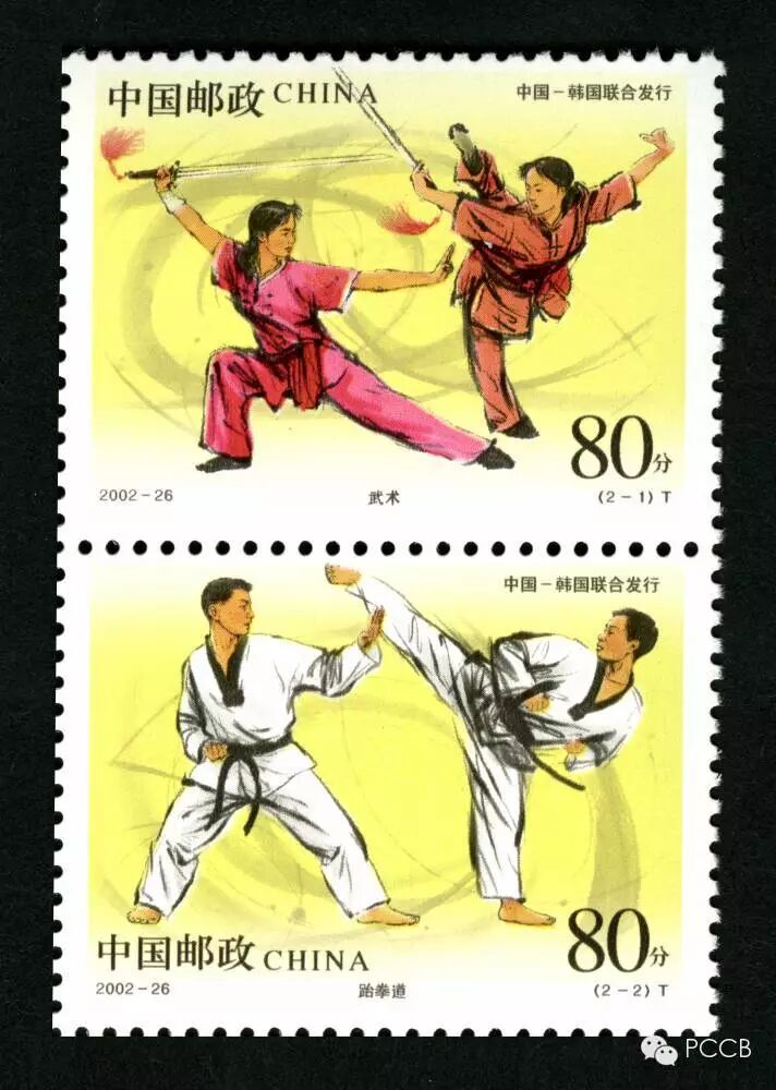 2002—26(T)《武术与跆拳道》1套2枚,中国和韩国联合发行;2004—16(J)《奥运会从雅典到北京》1套2枚,中国和希腊联合发行;2008—20(J)《奥运会从北京到伦敦》1套4枚,中国和英国联合发行,这也是中外联合发行邮票中,唯一一套4枚的品种。